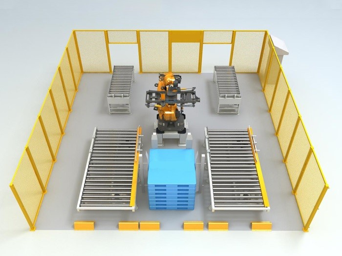 本机适应于化工、饮料、食品、啤酒、塑料、空调等生产企业对纸箱、袋装、罐装、盒装、瓶装等各种形状的成品进行装箱和码垛