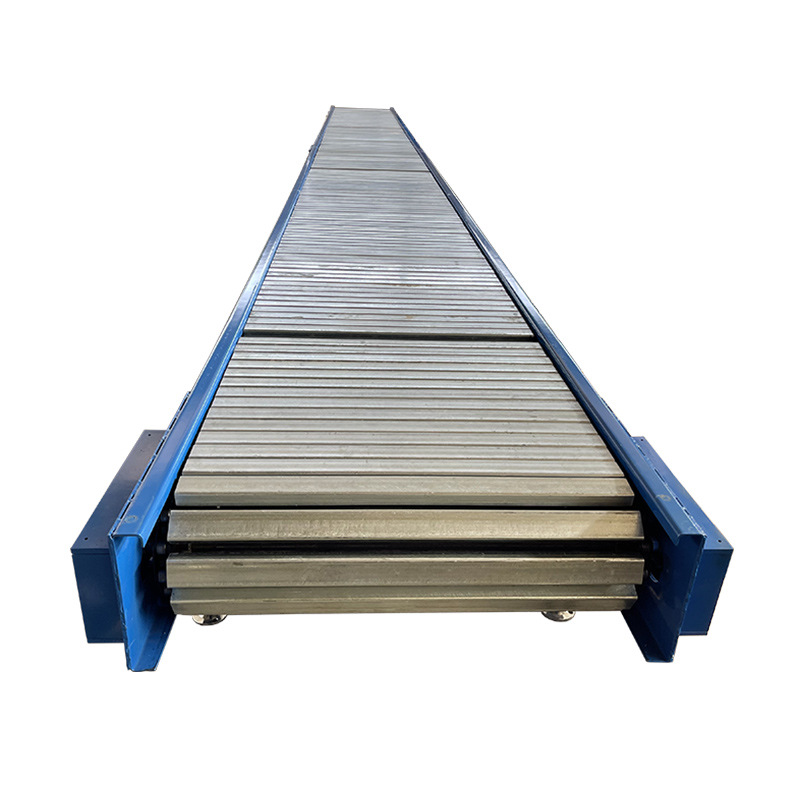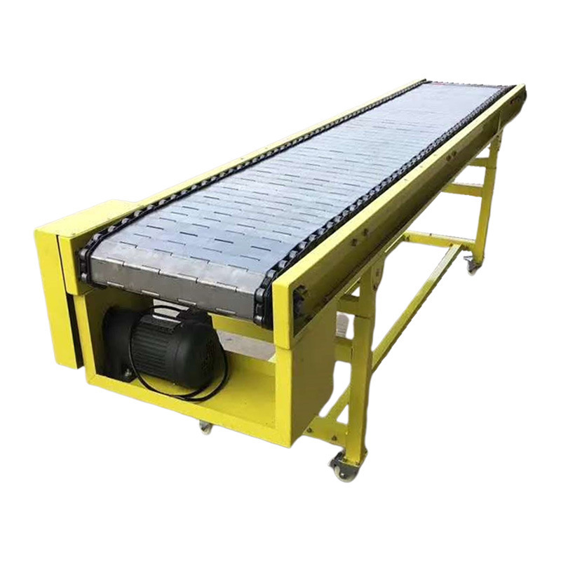 7、设备结构简单,维护方便。 链板输送机以标准链板为承载面,由马达减速机为动力传动;我们可以通过多列链板并行,使链板输送机做的很宽并形成差速,利用多列链板的速度差使多列输送在无挤压的情况下变为单列输送,从而满足饮料贴标、灌装、清洗等设备的单列输送的要求,同样也可以使单列变成多列并行走缓慢,从而产生储存量,满足储瓶台、冷瓶机的大量供料的要求,我们可以将两条链板输送机的头尾部做成重叠式的混合链使得瓶(罐)体处于动态过度状态,使输送线上不滞留物料,可以满足空瓶以及实瓶压力和无压力输送。 材质:碳钢、不锈钢、热塑链,根据您的产品的需要可选取不同宽度、不同形状的链板来完成平面输送、平面转弯、提升、下降等要求。 应用:直输链板宽度由63.5、82.5、101.6、114.3、152.4、190.5、254、304.8;转弯链板宽度有82.5、114.3、152.4、190.5、304.8,广泛用于食品、罐头、药品、饮料、化妆品和洗涤用品、纸制品、调味品、乳业及烟草等的自动输送、分配、和后道包装的连线输送。