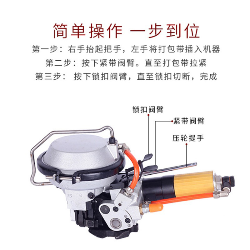 气钢带打包机,主要适用19mm钢带捆扎作业,该机对钢带的粘合部位采用凹凸扣的形式,节省了耗材成本。该机需配合平衡器使用,企业、物流、研究院等设备。